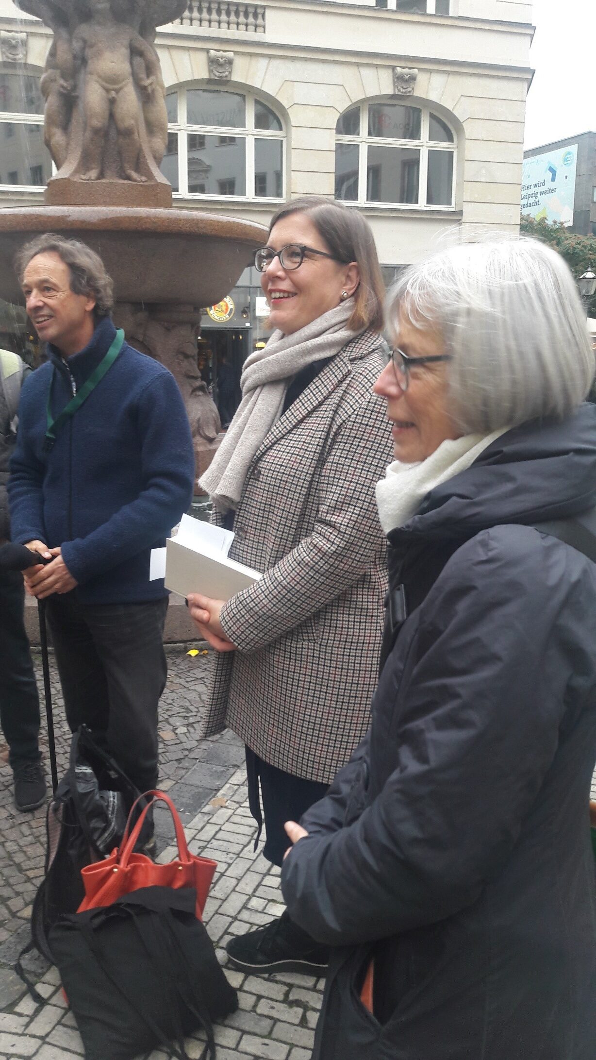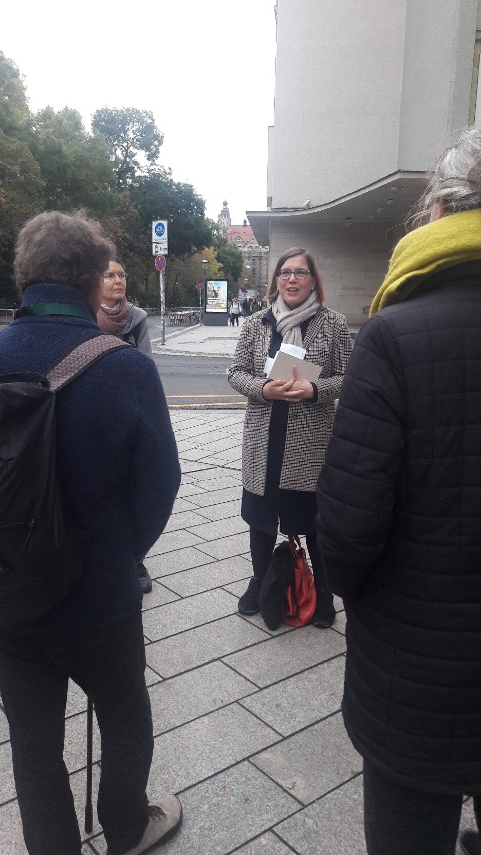Der zweite BookTalkWalk wurde am nieseligen Spätnachmittag des 7. Oktober von der Kulturbürgermeisterin Dr. Skadi Jennicke angeleitet. Ihr Jahrhundertbuch: Christoph Heins Roman „Verwirrnis“, dessen Handlung in weiten Teilen in Leipzig spielt. Der Roman beschreibt die Lebensgeschichte der fiktiven Person Friedeward Ringeling, der sein vom strengen Vater geprägtes Elternhaus direkt nach dem Abitur Richtung Leipzig verlässt, um seine Liebe zu Wolfgang Zernick – wenn auch im Verborgenen – leben zu können. Der Spaziergang führte vom Coffeebaum, einem bekannten Treffpunkt systemkritischer Hochschullehrer*innen, über das Uni-Hochhaus, das für den Helden des Buches der zentrale Ort seiner Emanzipation und Karriere war, zum Beyer-Haus, das über Jahrzehnte das Leipziger Studententheater war (- in dem übrigens auch die Kulturdezernentin ihre ersten Theatererfahrungen gesammelt hat). Zum Schluss folgte der Walk ein Stück der Route der jährlichen Christopher Street-Parade. Diese Parade findet in Leipzig seit 1992 als Teil der Selbstermächtigung der queeren Szene statt – just seit dem Jahr, in dem der Held von Christoph Heins Roman Selbstmord beging, um sich nicht als Schwuler outen zu müssen. Der Spaziergang endete am Bayrischen Bahnhof mit Blick in Richtung Deutsche Nationalbibliothek, die als Deutsche Bücherei ein für Friedeward Ringeling zentraler Ort der Lektüre und des Studiums war.