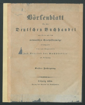 „Das Börsenblatt ist noch heute das Verbandsorgan des Börsenvereins des deutschen Buchhandels, nachdem es 1834 vom Börsenverein der Deutschen Buchhändler zu Leipzig gegründet wurde. Ab Jahrgang 1835 ging es unter der Bezeichnung „Amtliches Blatt des Börsenvereins“ in das Eigentum des Börsenvereins über und wurde von Teubner in Leipzig gedruckt. Das Börsenblatt erschien zunächst wöchentlich und seit 1867 werktäglich, 1945 wurde es vorübergehend eingestellt. In der sowjetischen Besatzungszone kam das Börsenblatt ab 1946 wieder im wöchentlichen Rhythmus heraus, in den westlichen Besatzungszonen ab 1945 hingegen mit dem Zusatz „Frankfurter Ausgabe“. Seit der Vereinigung beider Börsenvereine am 1. Januar 1991 erscheint nur noch eine gemeinsame wöchentliche Ausgabe mit der Leipziger Jahrgangszählung.“[1]