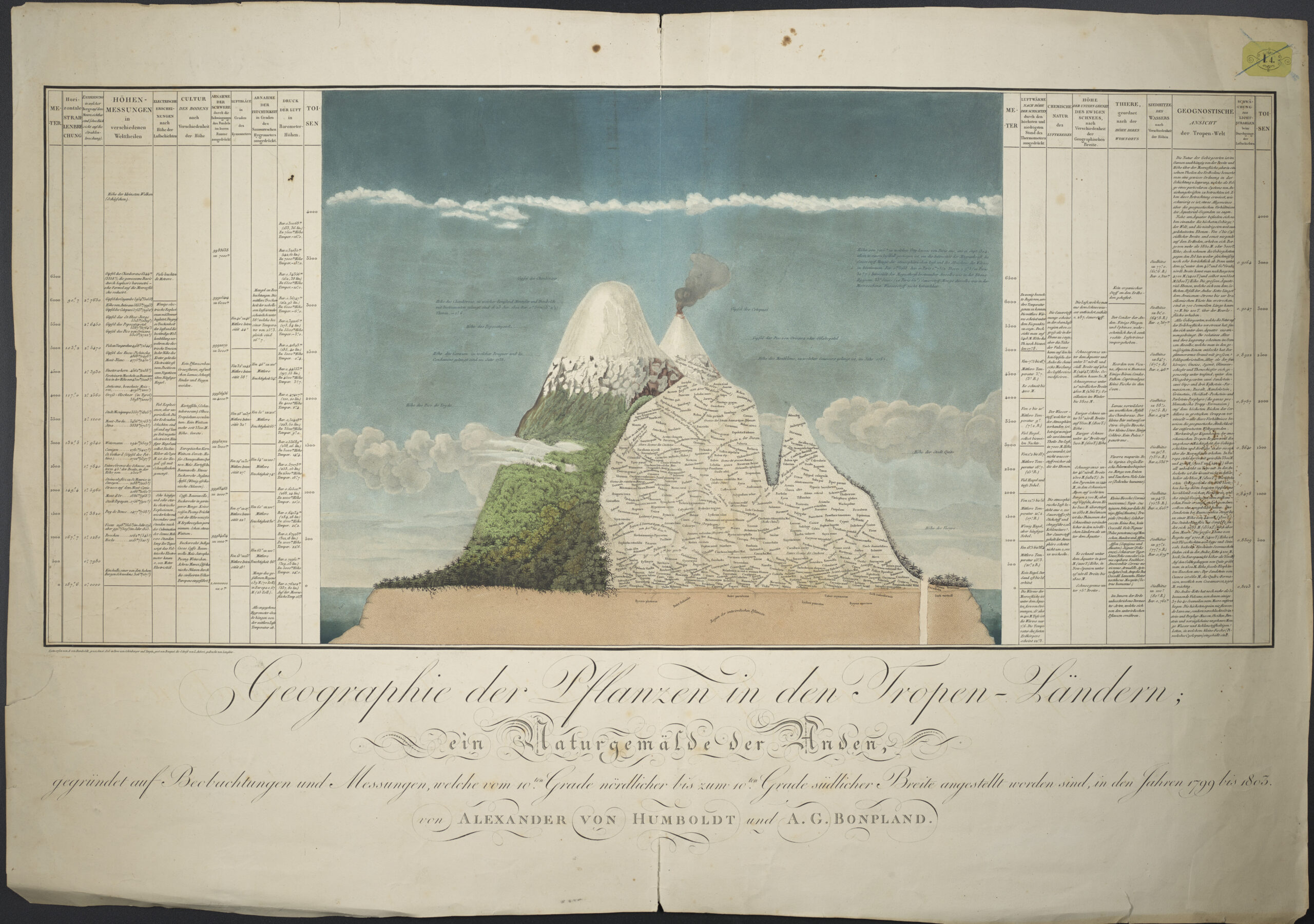Was bleibt letztlich von all dieser Vermessung, von dem möglicherweise „vermessenenen“ Ziel, die Welt wissenschaftlich zu erfassen, die „terra incognita“ zu bezwingen? Im Falle des unglaublichen Datenschatzes, welchen Humboldt zusammen mit Bonpland auf seinen Reisen sammelte – seien es geologische Proben, exotische Pflanzen oder eben Messwerte – diente dieser später als empirische Grundlage für seine geografischen und physikalischen Beschreibungen der Welt. Der « Atlas Géographique et Physique des Régiones Équinoxiales du Nouveau Continent » dokumentiert beispielsweise in topografischen Karten, thematische Karten und Landschaftsprofilen die Ergebnisse von Humboldt’s und Bonplands Amerika-Reise. All das floss auch in sein Spätwerk „Kosmos“ ein, dem monumentalen Versuch, das gesamte damals verfügbare Wissen über die Welt in einer zusammenhängenden Darstellung zu verschmelzen.