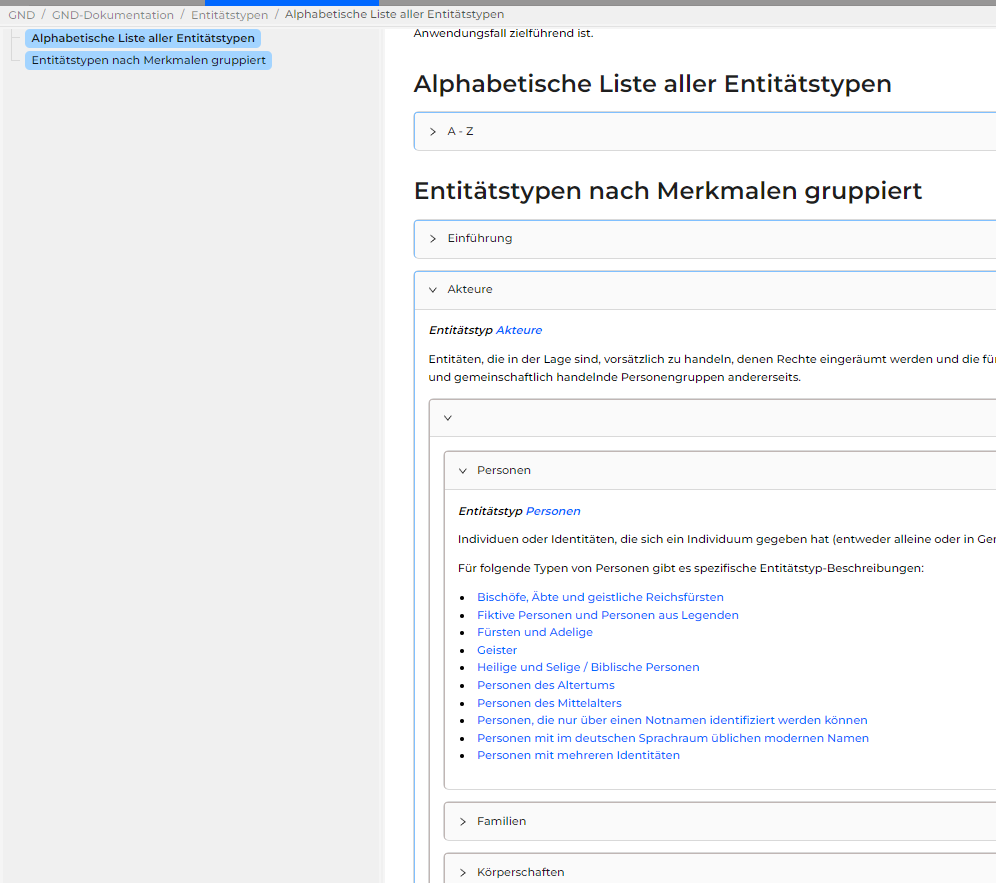 Der Bereich zur GND ist gegliedert in Allgemeines-Texte, die allgemeine Konzepte und Grundlagen enthalten, in Entitätstypbeschreibungen, die die früheren Erfassungshilfen ablösen und alles erläutern, was für die Erfassung eines bestimmten Entitätstyp benötigt wird sowie den Bereich, der mit Datenmodell überschrieben ist, und u. a. die Datenfeldbeschreibungen (den früheren Erfassungsleitfaden) enthält.