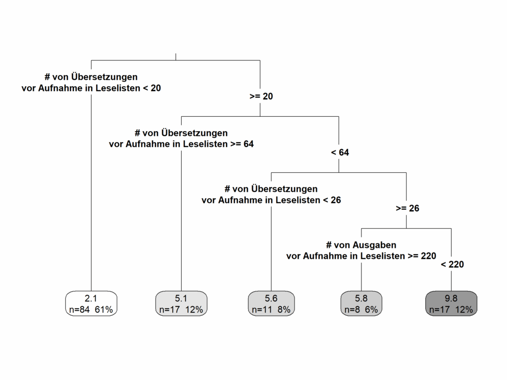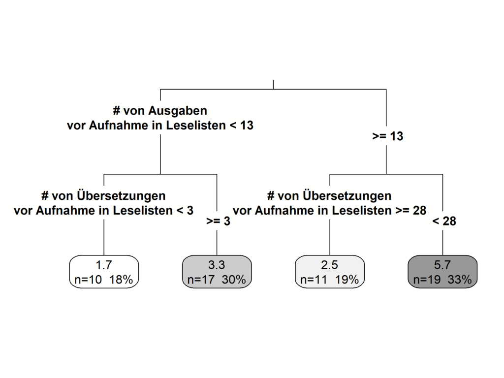 Die Verknüpfung der Abiturdaten mit den bibliografischen Informationen der DNB zeigt, dass Übersetzungen in verschiedene Sprachen sowie die Zugehörigkeit zu etablierten Buchreihen als Indikatoren für die Aufnahme in den Schulkanon dienen können. Auch die Zahl der Auflagen erweist sich als Prädiktor für die zeitliche Stabilität eines Werkes: Entscheidungsbaum-Analysen für Klassiker und zeitgenössische Literatur bestätigen, dass diese bibliografischen Merkmale die Wahrscheinlichkeit erhöhen, dass ein Werk über Jahre hinweg präsent bleibt.